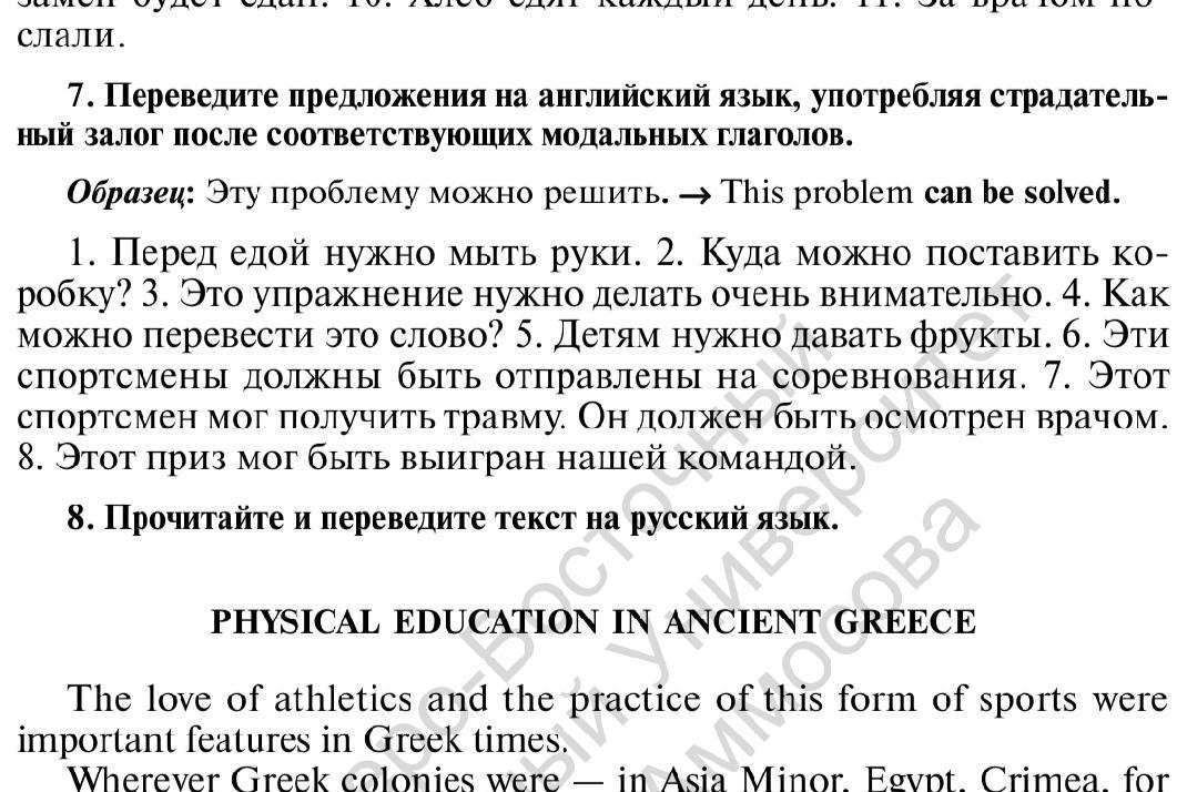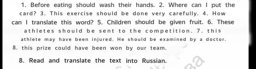 1. Wash your hands before eating. 2. Where can I put the box? 3. This exercise needs to be done very carefully. 4. How can this word be translated? 5. Children need to be given fruit. 6. These athletes must be sent for an athlete to be injured. He should be examined by a doctor. 8. This prize could have been won by our team.