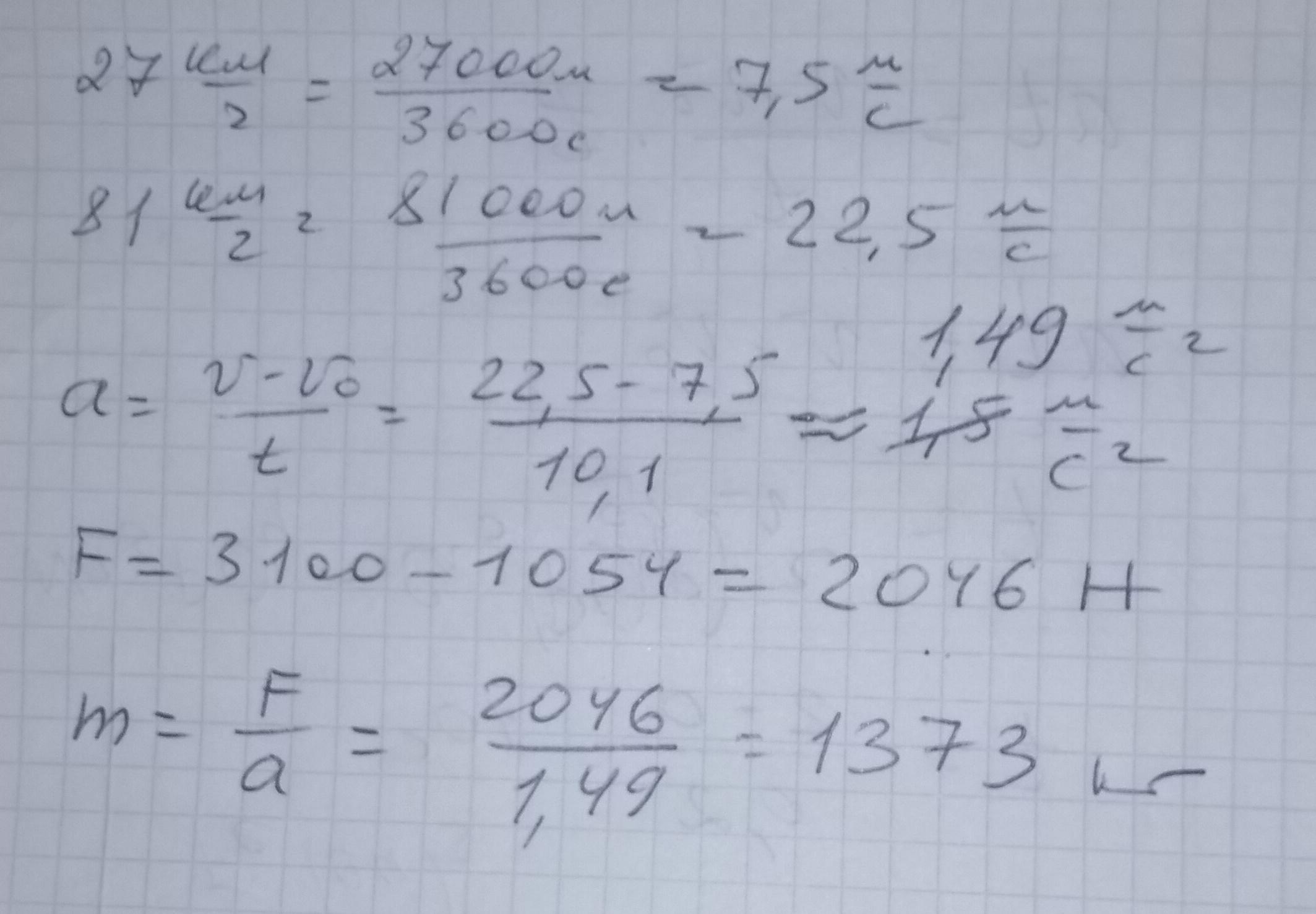 Легковая автомашина, ускоряясь, развивает силу тяги в 3100 Н и увеличивает скорость с 27 км/ч до 81 км/ч за 10,1 с. При увеличении скорости на машину действовала сила сопротивления, равная 1054 Н.
