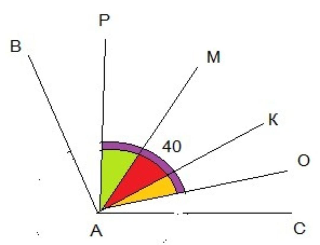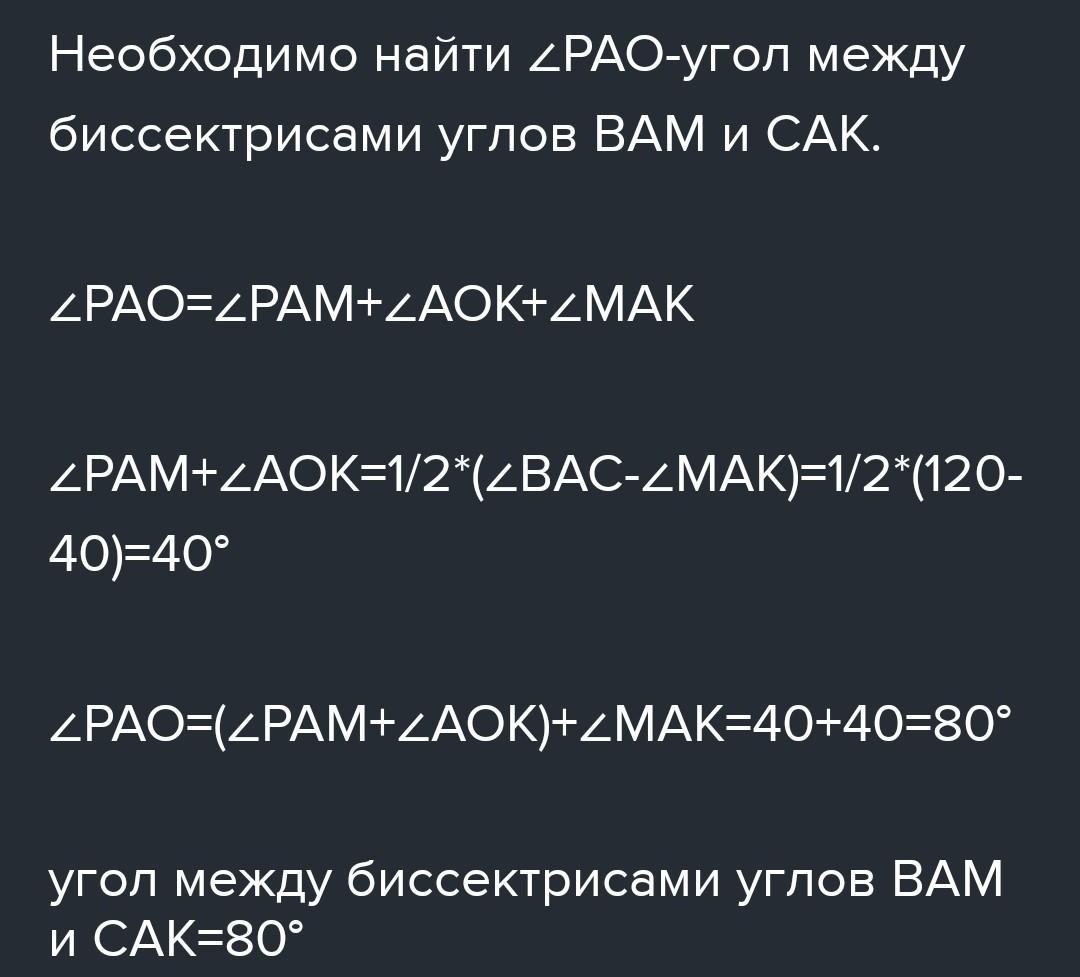внутри угла BAC равного 120 градусов, проведён Луч AK. внутри угла BAK проведён Луч AM, угол BAK равен 90, угол MAC равен 80. Найдите угол между биссектрисами углов BAM и CAK
