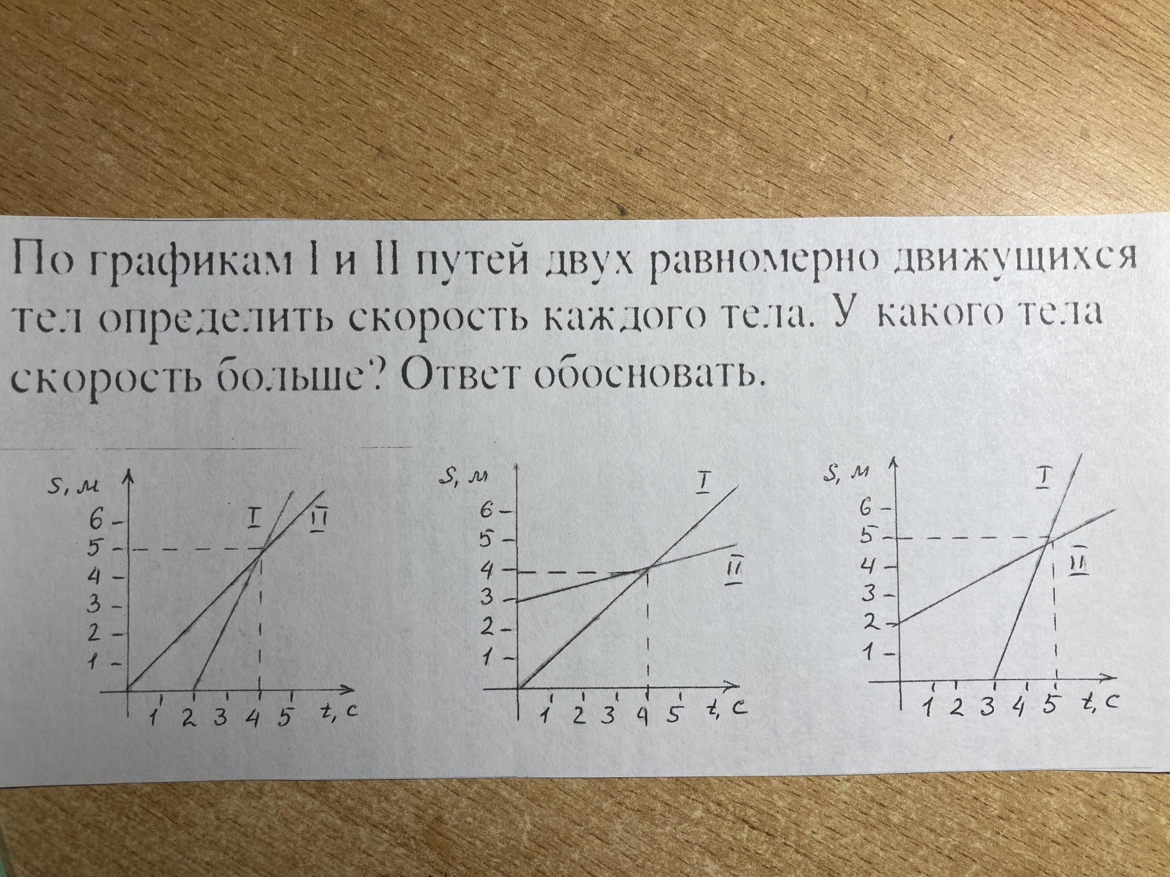 По графикам I и II путей двух равномерно движущихся тел определить скорость каждого тела. У какого тела скорость больше? ответ обосновать