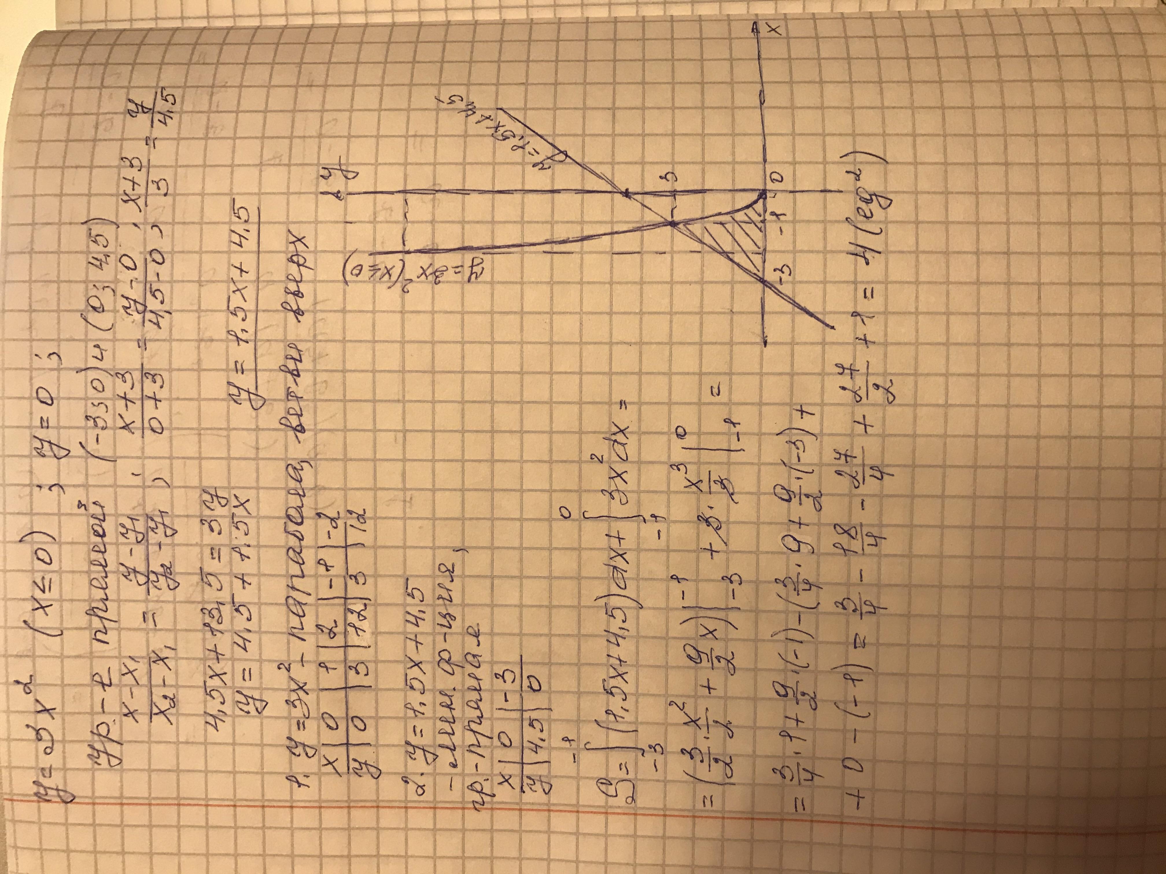 Вычислите площадь фигуры, ограниченной параболой у = 3х² (x ≤ 0), осью абсцисс и прямой, проходящей через точки (-3; 0) и (0; 4,5).