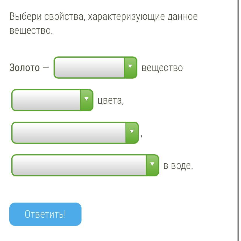 Ответ:возможно золото простое вещество желтоватого цвета, нерастворимо в воде.