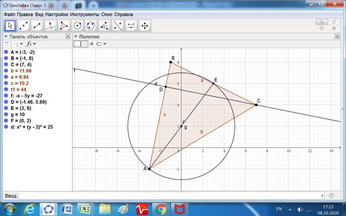 Находим координаты точки Е как середины отрезка ВС. В (-1, 8), С (7, 4)