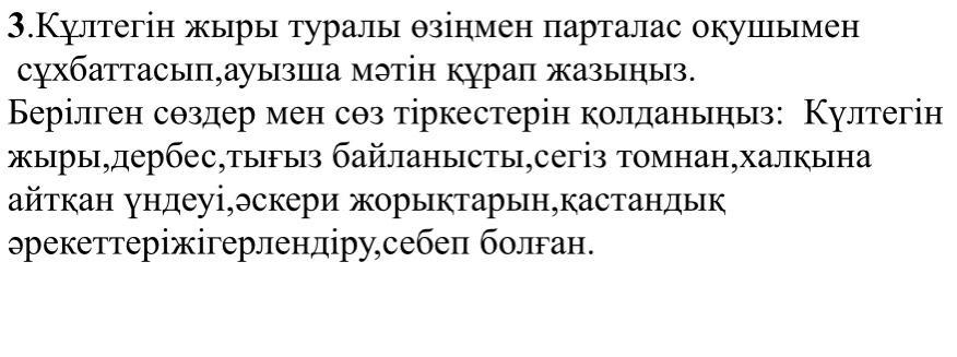 3.Кұлтегін жыры туралы өзіңмен парталас оқушымен сұхбаттасып,ауызша мәтін құрап жазыңыз.