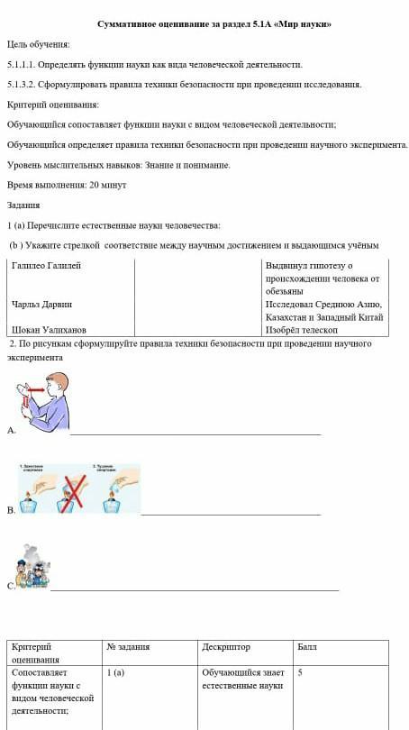 (b) Галилео Галилей - изобрёл телескоп. Чарльз Дарвин - Выдвинул гипотезу о происхождении человека от обезьяны. Шокан Уалиханов - исследовал Среднюю Азию, Казахстан и Западный Китай.