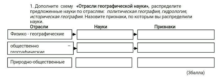 Дополните схему «Отрасли географической науки», распределите предложенные науки по отраслям: политическая география, гидрология, историческая география. Назовите признаки, по которым вы распределили науки.