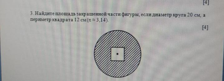 Площадь закрашенной фигуры равна разности площадей круга и квадрата.