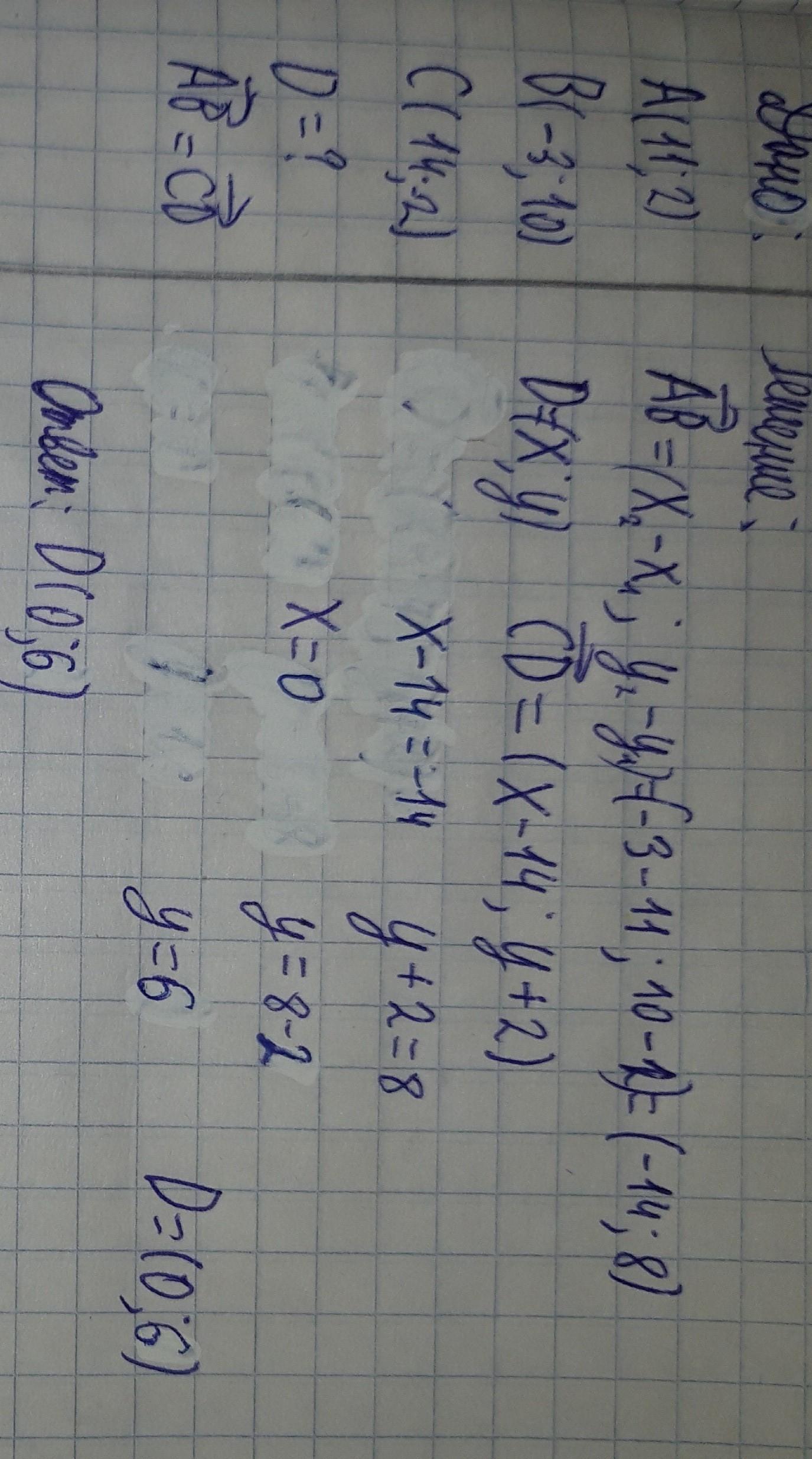 Даны точки A (11; 2), B (-3; 10) и C (14; -2). Найдите координаты точки D так, чтобы выполнялся вектор AB = вектор CD.