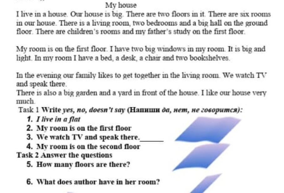 Я живу в доме .Наш дом большой, в нем два этажа. В нашем доме шесть комнат. На первом этаже гостиная, две спальни и большой холл. На первом этаже детские комнаты и кабинет отца. Моя комната находится на первом этаже. У меня в комнате два больших окна. В моей комнате есть кровать, стол, стул и две книжные полки. Вечером наша семья любит собираться в гостиной. Мы смотрим телевизор и разговариваем там. Так-же есть большой сад и двор перед домом. Мне очень нравится наш дом .