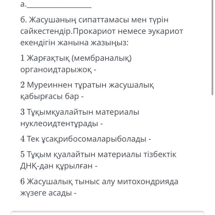 Ответ:1 прокариот, 2 эукариот, 3 эукариот, 4 эукариот, 5 прокариот, 6 прокариот