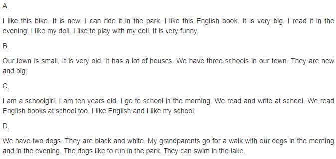 I like this bike. It is new. I can ride it in the park. I like this English book. It is very big. I read it in the evening. I like my doll. I like to play with my doll. It is very funny.
