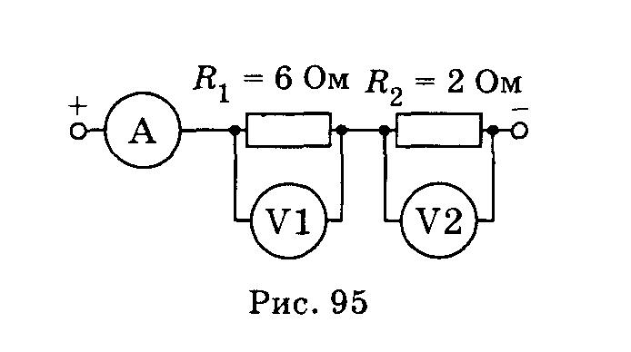Каковы показания амперметра и вольтметра V2 (рис. 95)?