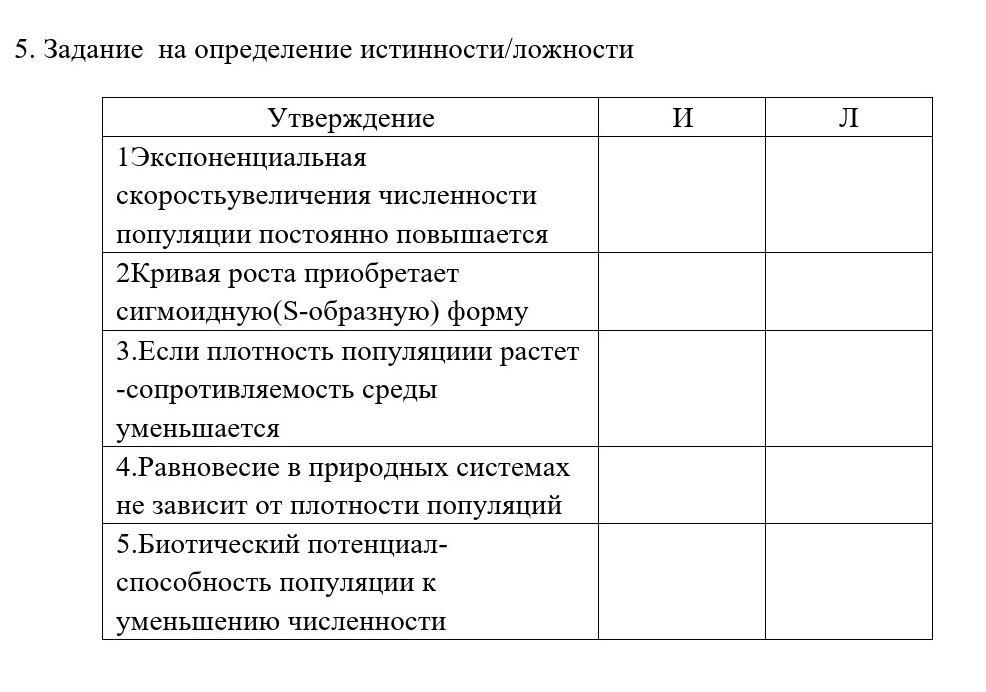 задание на определение истинности ложности утверждение первое экспоненциальной скоростью увеличения численности популяции постоянно повышается кривая роста приобретает сигну образную форму если плотность популяций растёт сопротивляемость среды уменьшается равновесие в природных системах не зависит от плотности популяций биотический потенциал способность популяции уменьшение численности