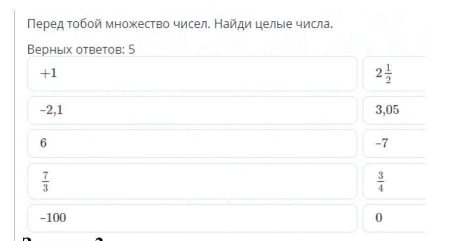 Перед тобой множества чисел. Найди целые числа верных ответ 5