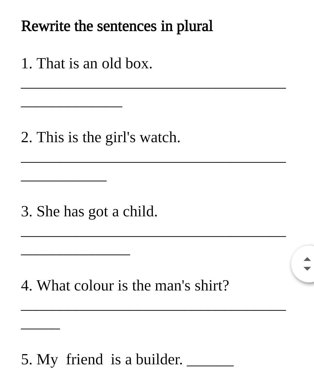 1. These are old boxes. 2. This is a ladies watch. 3. They have a child. 4. What color is the men's shirt? 5. My friends are builders.