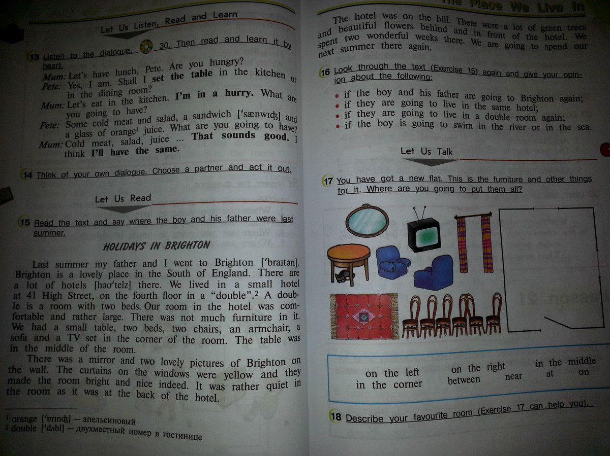 Прошлым летом я со своим отцом поехал в Брайтон. Брайтон - прекрасное место на Юге Англии. Там есть много отелей. Мы жили в небольшом отеле на Хайд стрит, 41 на четвертом этаже в “двойной” комнате. Двойная комната - это комната с двумя кроватями. Наша комната в отеле была удобной и довольно большой. Большого количества мебели в ней не было. У нас был маленький стол, две кровати, два стула, кресло, диван и телевизор в комнате. Стол стоял посреди комнаты. Так же было зеркало и две прекрасных картины Брайтона на стене. Занавески на окнах были желтыми, и они делали комнату ярче. В комнате было довольно тихо, поскольку она находилась в задней части отеля. Отель находился на холме. Там было много зеленых деревьев и прекрасных цветов за отелем. Мы замечательно провели там две недели. Мы собираемся провести наше следующее лето именно здесь.
