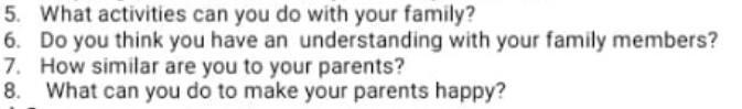 5. Чем вы можете заниматься со своей семьей? 6. Как вы думаете, у вас есть понимание с членами вашей семьи? 7. Насколько вы похожи на своих родителей? 8. Что вы можете сделать, чтобы ваши родители были счастливы?