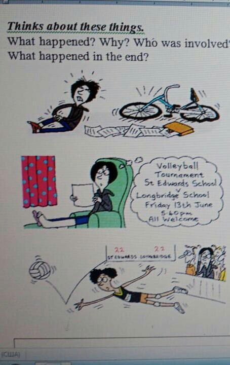 The woman in a bicycle with black hair was in a hurry to work, but she fell from her bike and injured her leg, so after going home from the hospital she decided to read the newspaper, and she saw that her son is going to play volleyball tournament at his school, but when she came to the tournament, she saw his team losing, so she became sad.
