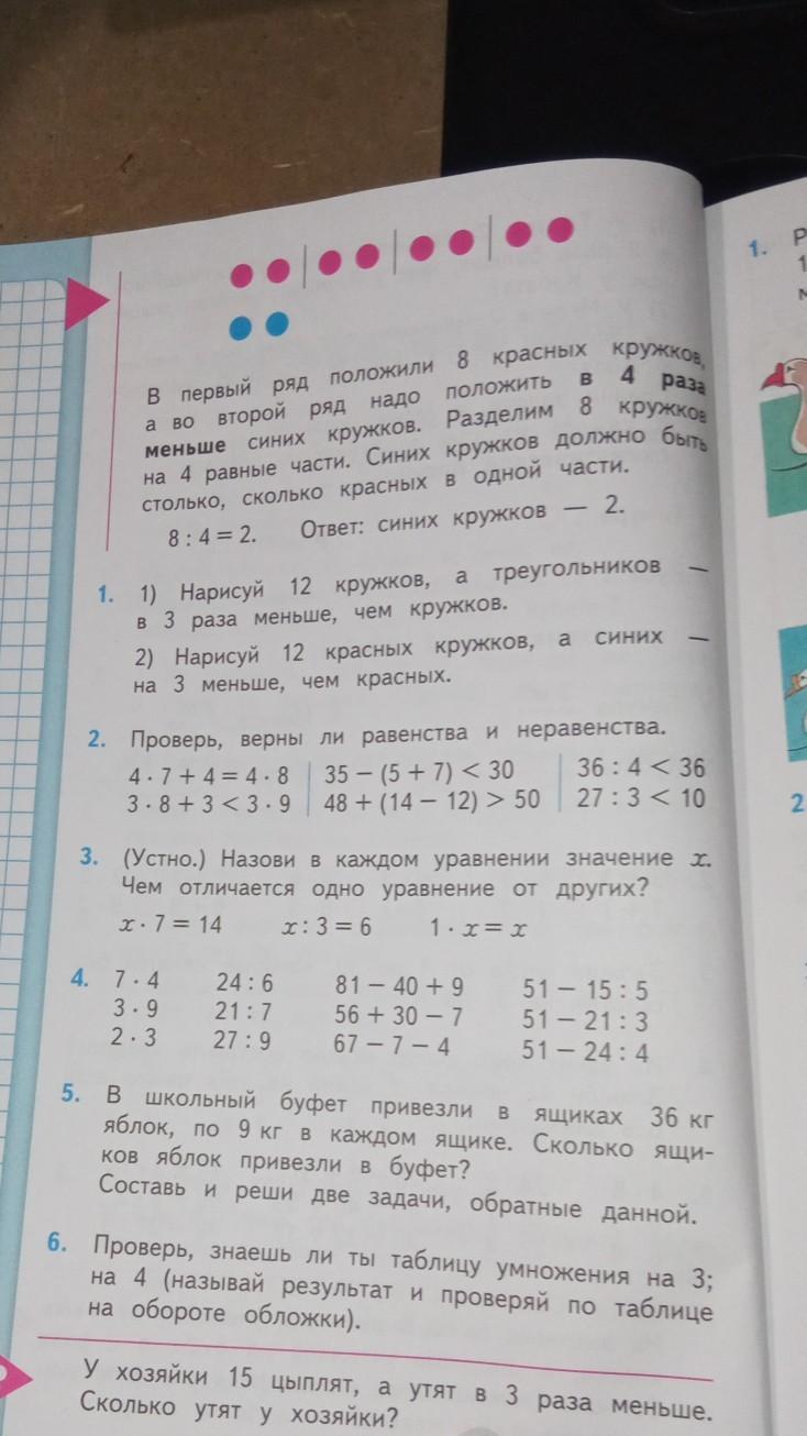 1. нарисуйте 12 кружков а треугольников 9 нарисуйте 12 красных а синих 9 2. 1 нет 2 да 3 да 4 нет 5 да 6 нет 3. разные ответы в 1 ответ х=2 во 2 х=18 в 3 х=1х