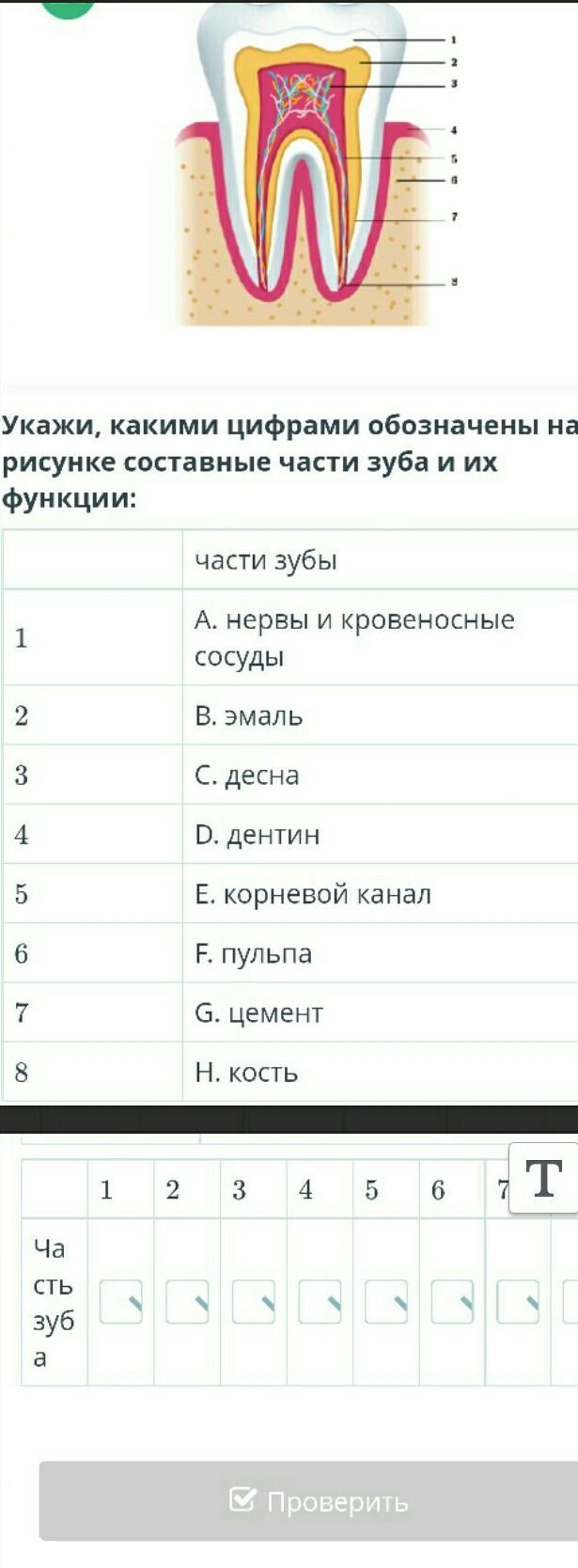 1. эмаль 2.дентин. 3.пульпа. 4.десна. 5. нервные волокна. 6. корневой канал 7.цемент. 8. не знаю