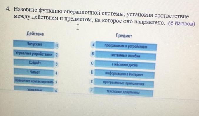 Назовите функцию операционной системы, установив соответствие между действием и предметом, на которое оно направлено. (6 баллов)
