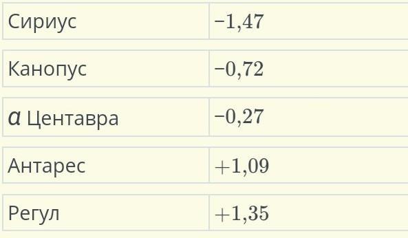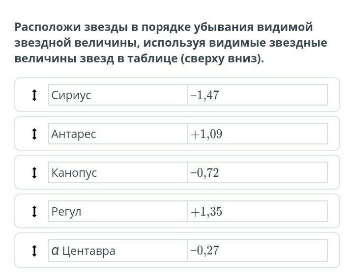 Расположи звезды в порядке убывания видимой звездной величины, используя видимые звездные величины звезд в таблице (сверху вниз).