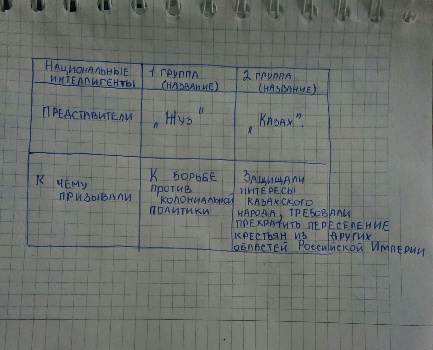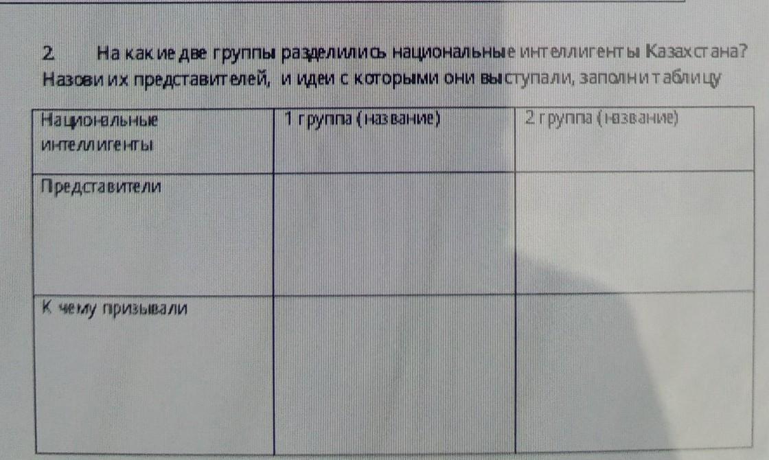 На какие две группы разделились национальные интеллигенты Казахстана? Назови их представителей, и идеи с которым они выступали ,заполни таблицу.
