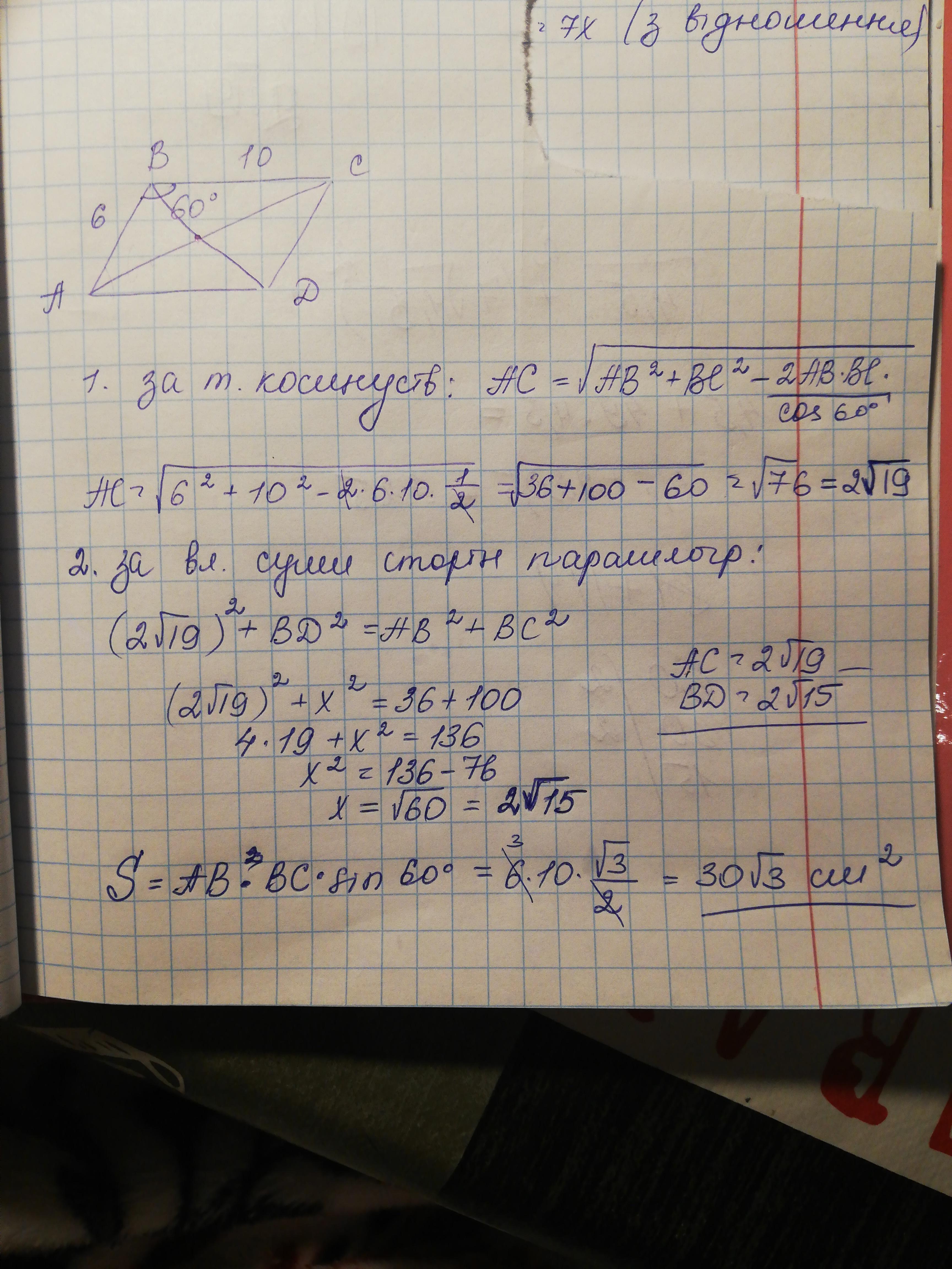 Сторони паралелограма дорівнюють 6 см і10 а кут 60 градусів знайти сторони діагоналі пралелрграма і його площу