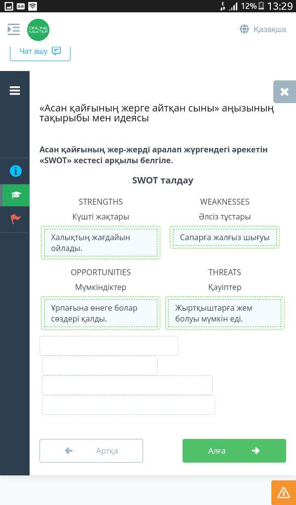 Асан қайғының жер-жерді аралап жүргендегі әрекетін «SWOT» кестесі арқылы белгіле.