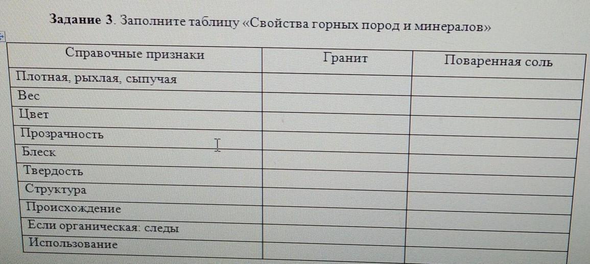 Задание 3. Заполните таблицу «Свойства горных пород и минералов»