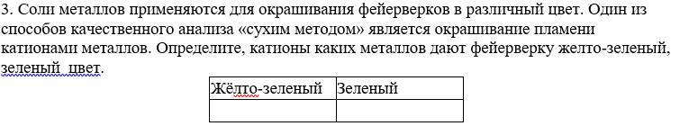 3. Соли металлов применяются для окрашивания фейерверков в различный цвет. Один из способов качественного анализа «сухим методом» является окрашивание пламени катионами металлов. Определите, катионы каких металлов дают фейерверку желто-зеленый, зеленый цвет.