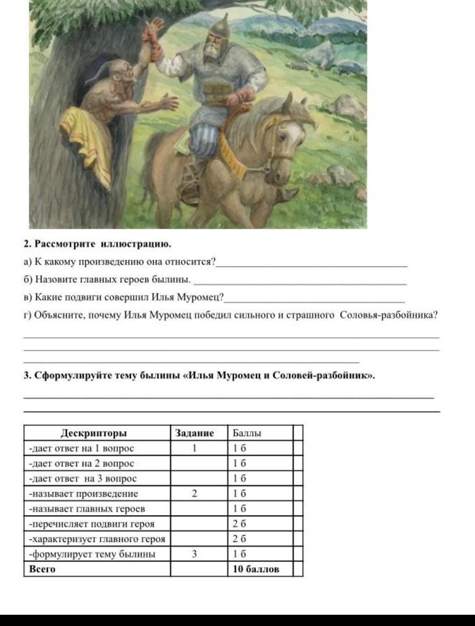 г) Илья Муромец отказался стать в Чернигове воеводой, потому что цель его была иная: попасть к обедне в Киев, а целью его жизни была защита земли Русской. Он победил Соловья-разбойника, потому что не сомневался в своей правоте, жаждал справедливости, верил в свои силы.