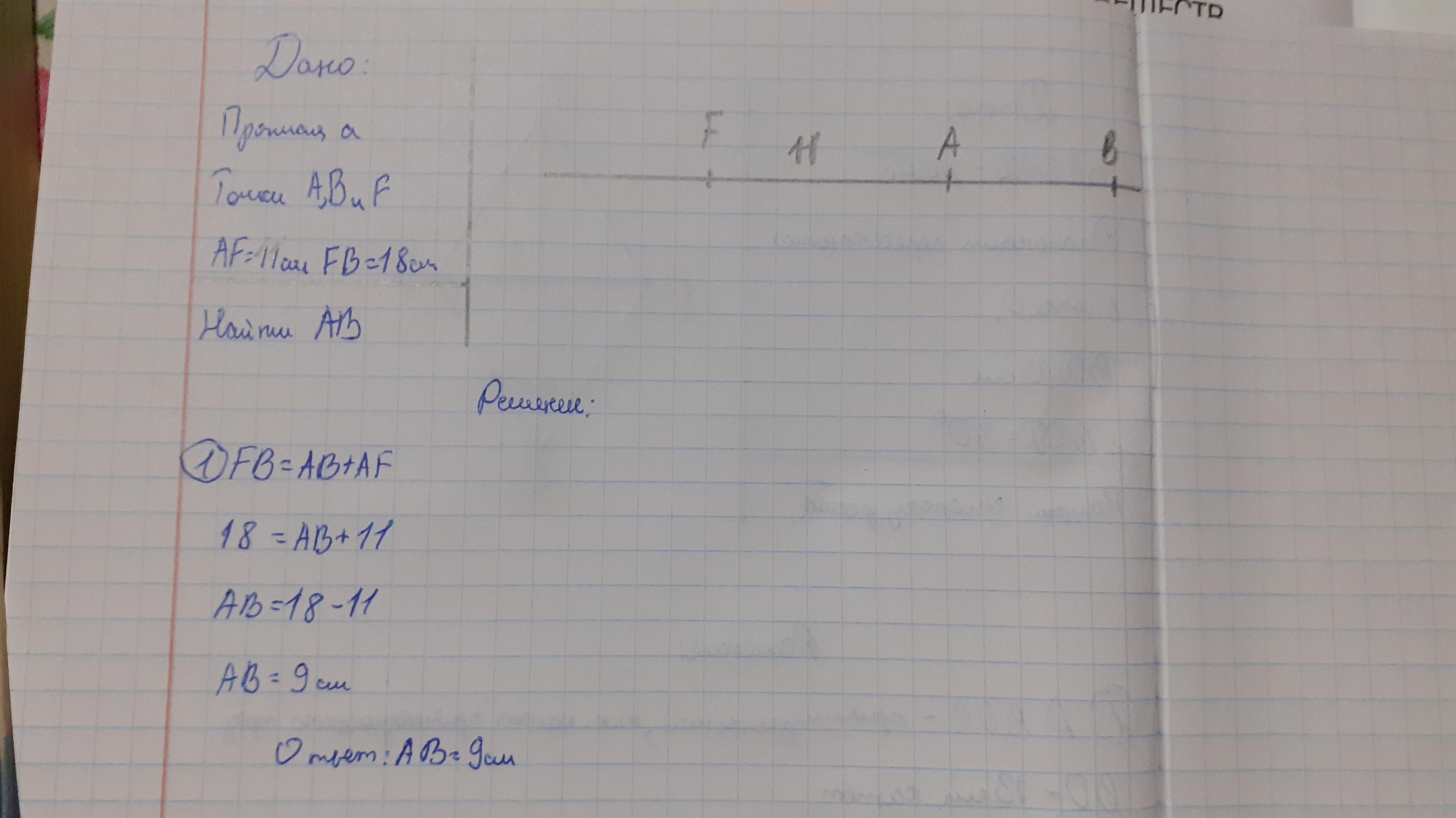на прямой точка A лежит между точками F и B Найди длину отрезка AB,если AF равно 11 см FB= 18см
