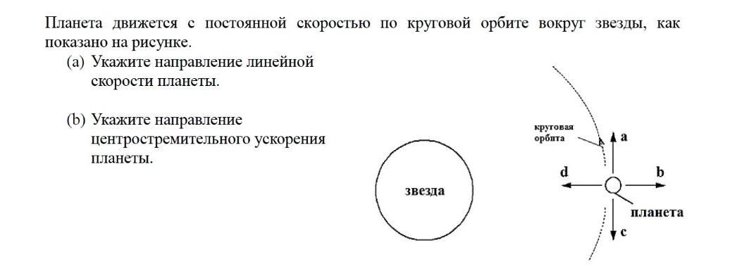 Помогите срочно Планета движется с постоянной скоростью по круговой орбите вокрут звезды, как показано на рисунке. (а) Укажите направление линейной скорости плтанеты. (b) Укажите направление центростремительного ускорения планеты.