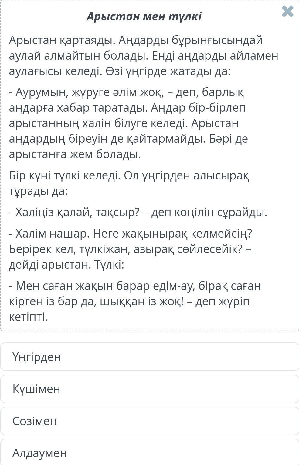 -Аурумын,жүруге әлім жок,-деп бір-бірлет арыстанның халін білуге келеді.Арыстан аңдардың біреүінде қайтармайды.Бәрі де арыстанға жем болады.