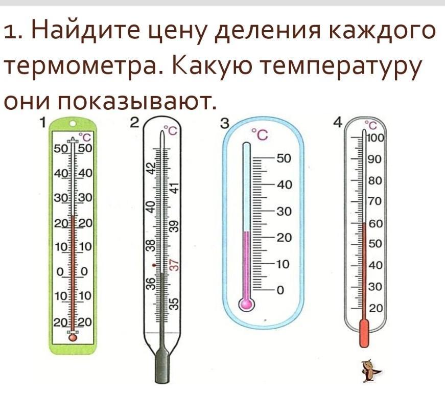 пж помогите Найдите цену деления каждого Температура. Какую температуру они показывают