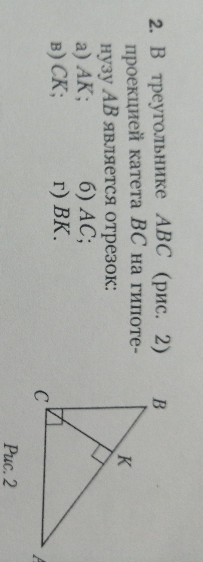 Проекця катета ВС на гипотенузу АВ отрезок ВК