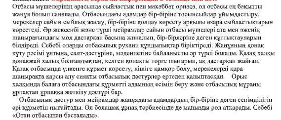 тірек сөздер: отбасы мүшелері, сыйластық, махаббат, бақытты жанұя. Рухани құндылықтар, салт- дәстүр, ақ дастарқан, үлкенге құрмет, кішіге қамқор, қонақжай,есімін беру, ұрпаққа жеткізу.. Отбасылық мұра,