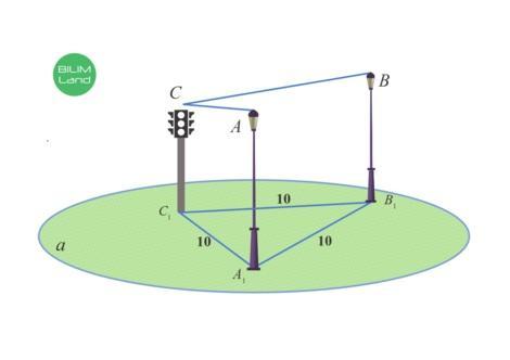 На одинаковом расстоянии 10 метров друг от друга расположены два световых столба (АА1 и ВВ1) и светофор (СС1). Высота световых столбов составляет 5 метров, а высота светофора – 3 метра. От верхних точек световых столбов до верхней точки светофора проведены электрические провода. Определи длину электрического провода.