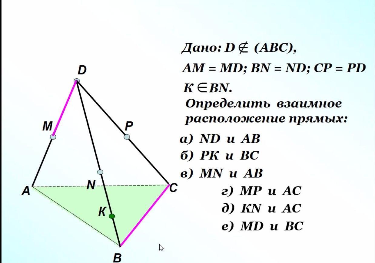 д) точки K и N не принадлежат плоскости (ACD), в которой лежит прямая AC, а прямая KN пересекает плоскость (ACD) в точке D, не принадлежащей прямой AC, поэтому прямые KN и AC не имеют общих точек и KN∦AC, иначе KN и AC лежали бы в одной плоскости.