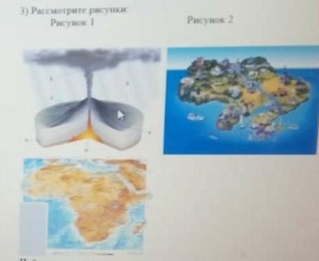 На рисунках изображены вулкан, остров и географическая карта.