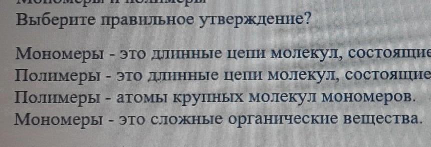 мономеры-это длинные цепи молекулы состоящие из звеньев полимеров полимеры- это длинные цепи молекулы состоящие из звеньев мономеров полимеры-атомы крупных молекул мономеров мономер- это сложные органические вещества