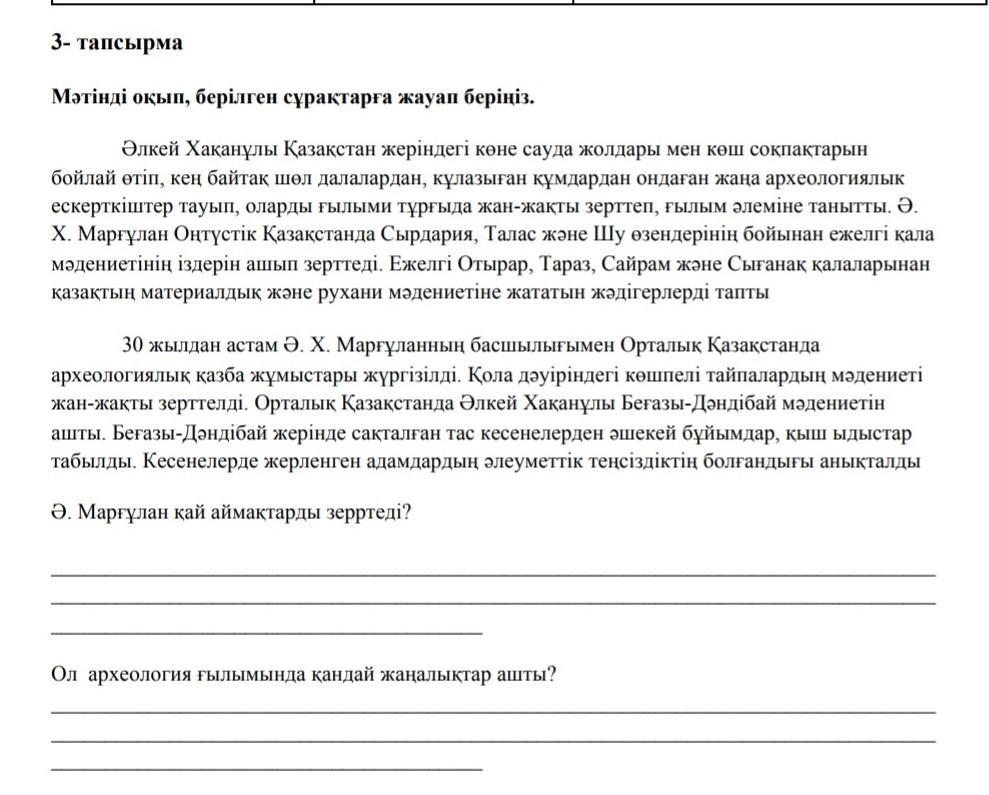 Ответ: 1.сұраққа жауап:Х.Марғұлан Оңтүстік Қазақстанда Сырдария,Талас жəне Шу Өзендерінің бойынан ежелгі қала мəдениетінің іздерін ашып зерттеді