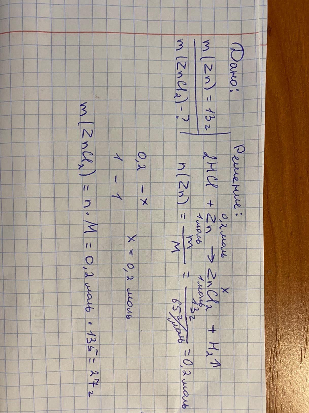 Избыток цинка массой 13 г растворяют в соляной кислоте. Рассчитайте количество и массу образовавшейся соли.