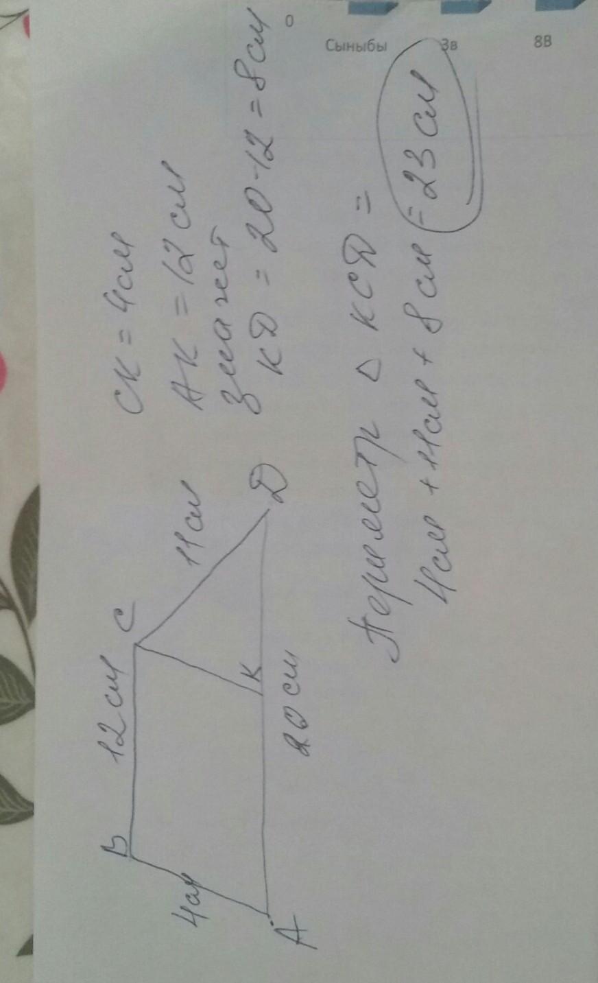 Основания трапеции равны 12см и 20см, а боковые стороны 4 см и 11 см. Из конца меньшего основания проведена прямая , параллельная меньшей боковой стороне. Найдите периметр отсеченного треугольника.