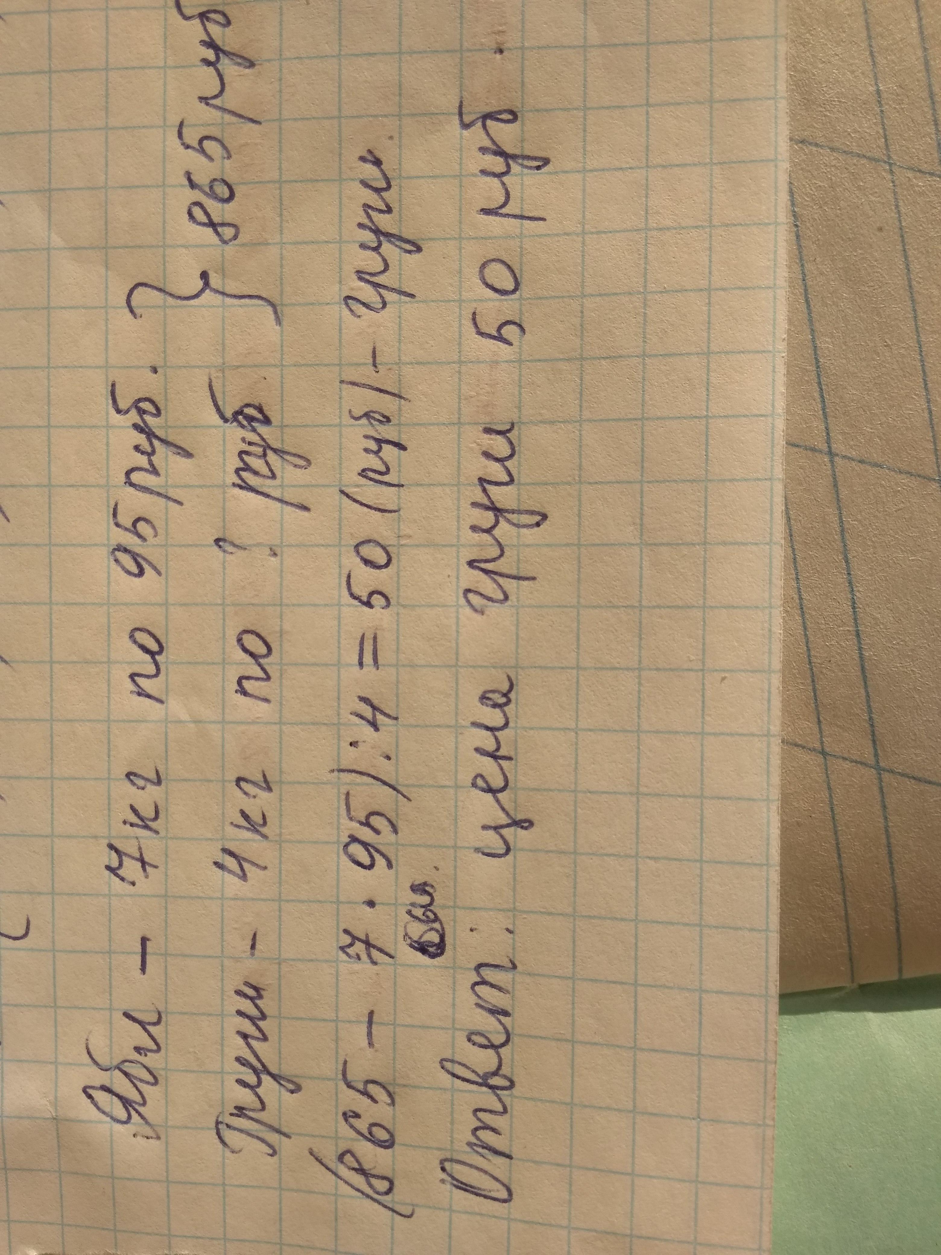 Купили 7 кг яблок по цене 95 рубля/кг и 4 кг груш. Какова цена груш если стоимость всей покупки 865 рублей?