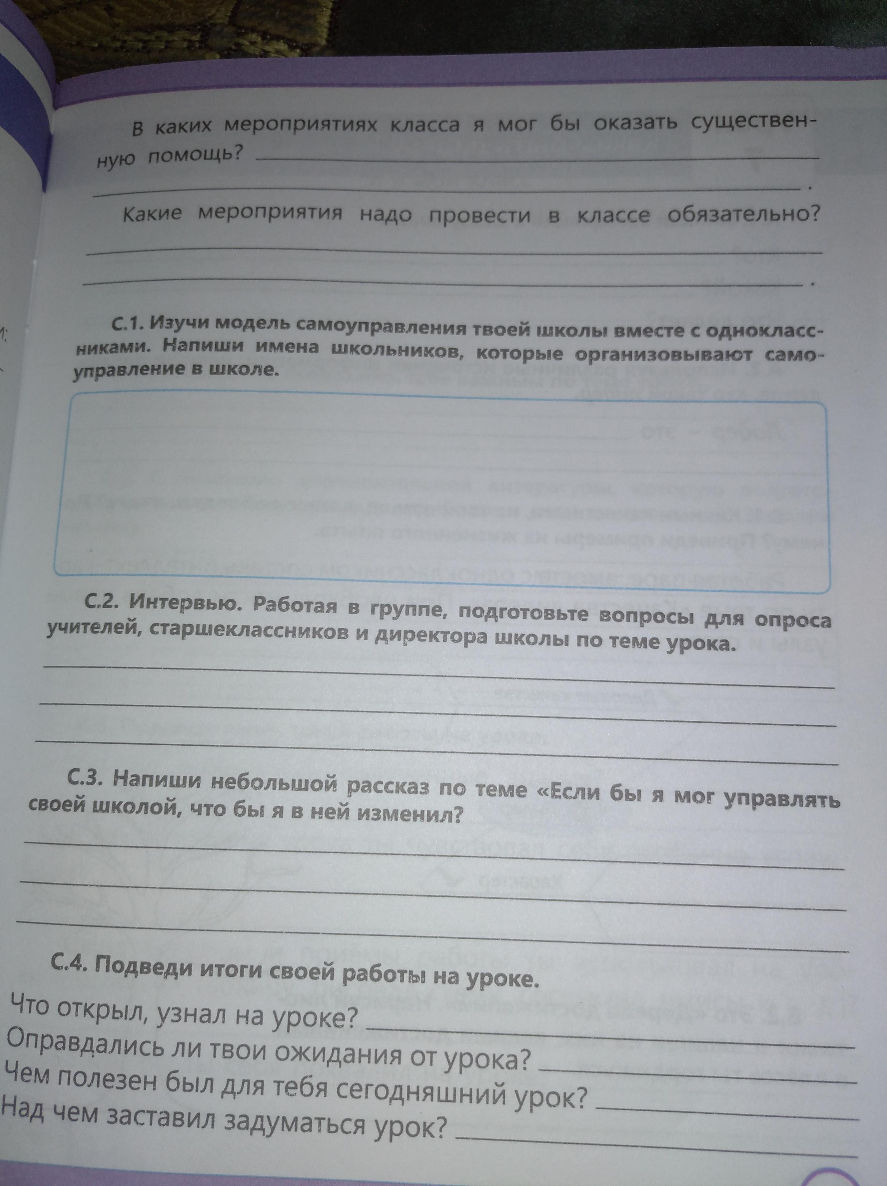 в каких мероприятиях класса я мог бы оказать существенную помощь? какие мероприятия надо привести в классе обязательно? изучим модель самоуправления твоей школы? вместе с одноклассниками напиши имена школьнику в которых организация самоуправления в школе. интервью работы в группе подготовить вопросы для опроса училась старшекласснику и директора школы по теме урока. напиши небольшой рассказ по теме если бы могу управлять своей школы чтобы я изменил? подведи итоги своей работы на уроках что открыл узнал на уроке. у продал если твои ожидания от урока Чем полезен этот был тебе сегодняшний урок над чем заставляет задуматься урок.