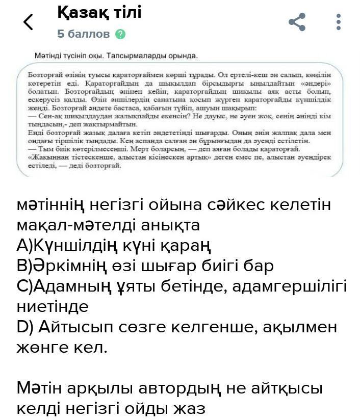 Мәтінің негізгі ойын сәйкес келетін мақал мәтел менің ойымша В)Әркімнің өзі шығар биігі бар.