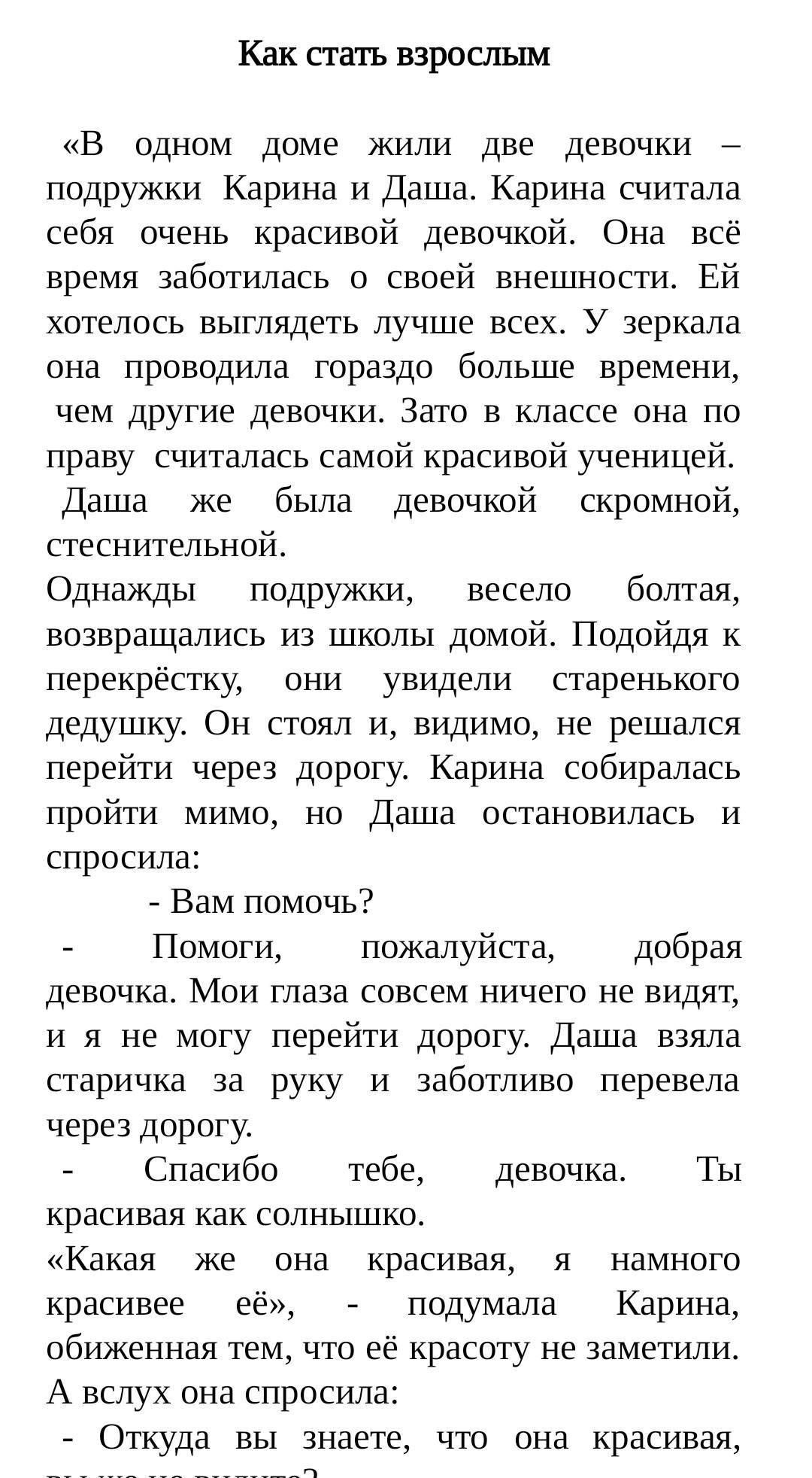 3. Я считаю, что основная мысль этого текста в том, что самая главная красота, это внутренняя, это красота от сердца, от души, это доброта и отзывчивость, а внешняя красота не так уж и важна. Даша здесь показала, что она красивее Карины, потому что она добрее, она помогла бедному старику перейти дорогу.
