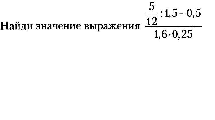 \frac{\frac{5}{12}:1,5-0,5 }{1,6*0,25}=\frac{\frac{5}{12}:\frac{3}{2}-0,5}{0,4} =\frac{\frac{5}{12}*\frac{2}{3}-0,5}{0,4}=\frac{\frac{5}{18}-\frac{1}{2}}{0,4}=\frac{\frac{5}{18}-\frac{9}{18}}{\frac{2}{5}}=-\frac{4}{18}*\frac{5}{2}=-\frac{10}{18}=-\frac{5}{9}\\\\Otvet:\boxed{-\frac{5}{9}}